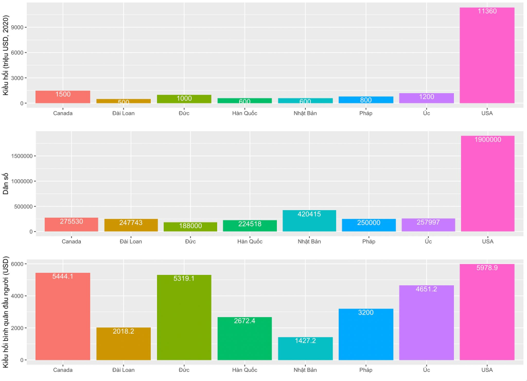 Biểu đồ trên: Số kiều hối trong năm 2020 (số liệu của World Bank) từ Mĩ, Canada, Úc, Đức, Pháp, Hàn, Nhật, Đài, v.v. Biểu đồ giữa: Số kiều bào trong năm 2020-2021. Biểu đồ dưới: Kiều hối tính trên đầu người (USD) năm 2020. Đồng hương Mĩ gởi về nhiều nhứt, sau đó là Canada / Gia Nã Đại, Đức, và Úc. Các nước có xuất cảng lao động (Đài Loan, Hàn, Nhật) cũng có gởi nhưng không nhiều.