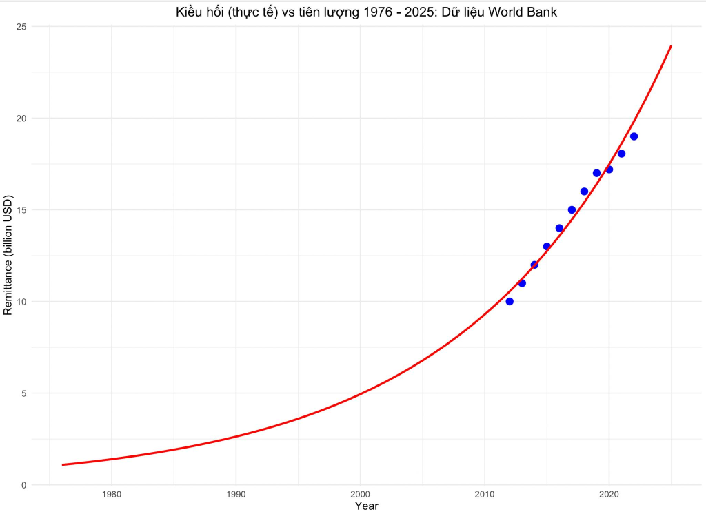 Thời đó, bất cứ người tị nạn nào cũng gởi về quê nhà. Người già không đi làm cũng nhín tiền trợ cấp xã hội để gởi về Việt Nam. Ai ai cũng đóng hàng hoá thành kiện để gởi về Việt Nam. Hàng hoá bao gồm thuốc men, quần áo, vải, bánh kẹo, đồ gia dụng, v.v. Những món hàng từ hải ngoại gởi về gia đình có hai mục đích rõ rệt. Một là đáp ứng nhu cầu sống còn trước mắt (quần áo, xà bông, thuốc men, v.v.). Hai là giá trị trao đổi: các vật dụng này có thể được dùng để đổi lấy thực phẩm tươi và các nhu yếu phẩm khác, vốn không thể gởi từ nước ngoài nhưng lại luôn khan hiếm ở Việt Nam thời hậu chiến. Và, không thể thiếu được là tiền. Gởi tiền chánh thức, bán chánh thức và chui về gia đình bên Việt Nam. Tất cả — xin nhấn mạnh là ‘tất cả’ — người tị nạn đều gởi tiền về quê nhà (bên cạnh những thùng quà). Gởi thường xuyên, có khi hàng tháng. Tôi biết rõ, vì chính anh em tôi là những người từng làm như vậy. Không ai biết được số tiền mà người tị nạn gởi về quê nhà trong thập niên 1976 – 1986. Nhưng theo một nghiên cứu, chỉ năm 1984, Thượng nghị viện Mĩ ước tính người tị nạn gởi về khoảng 200 triệu USD (tương đương với chừng 800 triệu USD ngày nay). Thường thì số tiền mà cộng đồng bên Mĩ gởi về Việt Nam chiếm tỉ trọng 60-65% tổng số kiều hối trên thế giới gởi về Việt Nam. Nói là ‘trên thế giới’, nhưng trong thực tế thì chỉ xoay quanh các nước như Mĩ, Úc, Gia Nã Đại / Canada, Pháp, Đức, và các nước Bắc Âu. Nếu lấy tỉ trọng kiều hối từ Mĩ là 60% trên tổng số kiều hối, thì chúng ta có thể suy đoán rằng năm 1984, tổng số kiều hối từ cộng đồng tị nạn trên thế giới là 1.33 tỉ USD. ■Ước tính kiều hối trước 1993 Nếu tính từ 1976 đến 1993, với con số người tị nạn gia tăng hàng năm và cuộc sống dần dần ổn định, với giả định kiều hối tăng theo kiểu tích luỹ. Nhưng làm sao ước tính số kiều hối trong thời gian đỏ? May mắn thay, tôi tìm thấy dữ liệu của Ngân hàng Thế giới mà báo SGGP có trích dẫn từ 2012 đến 2022 như sau [4]: 2012: 10 tỉ USD 2013: 11 tỉ USD 2014: 12 tỉ USD 2015: 13 tỉ USD 2016: 14 tỉ USD 2017: 15 tỉ USD 2018: 16 tỉ USD 2019: 17 tỉ USD 2020: 17.2 tỉ USD 2021: 18.06 tỉ USD 2022: 19 tỉ USD Dựa vào những con số trên và dùng phương pháp hồi qui tuyến tính, chúng ta có thể ước tính ngược con số kiều hối 1976 – 1993 (xem biểu đồ).
