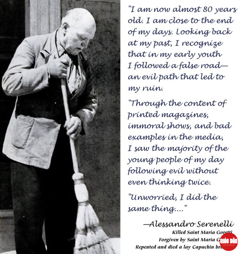 Khi tôi mới đôi mươi, tôi đã phạm tội trọng. Bây giờ, ký ức đó thật khủng khiếp đối với tôi. Maria Goretti giờ đây đã là thánh, là thiên thần của tôi, đã hướng dẫn và cứu tôi qua sự quan phòng của Thiên Chúa. Tôi vẫn nhớ như in những lời Goretti trách móc và tha thứ cho tôi. Goretti đã cầu thay nguyện giúp cho tôi, dù tôi là kẻ sát nhân.