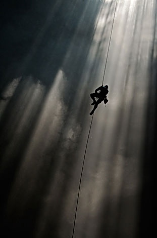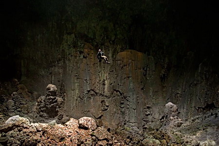 Cách duy nhất để vào hệ thống hang động là đu dây từ từ vách hang Loọng Con, cao khoảng 70m.