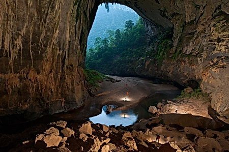 Lối vào hang Sơn Đoòng: “Mặc dù đây là những hang động vô cùng lớn, nhưng chúng gần như vô hình cho đến khi bạn ở ngay trước chúng”, một nhà thám hiểm nhận xét. Các thợ săn đã phát hiện ra chúng khi thấy gió hắt lên từ những cửa hang dưới lòng đất.