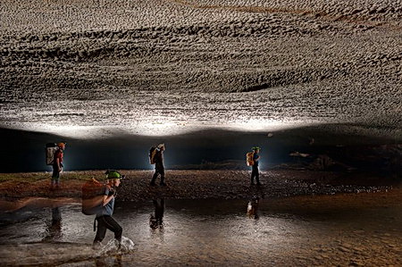 Khoảng không gian thu hẹp giữa hang Én. Các nhà thám hiểm đứng bên dưới mái hang đầy vỏ sò tích tụ sau nhiều năm ngập nước.