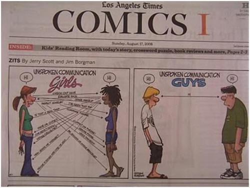 Các ông thường phàn nàn các bà là miệng thì biểu người ta quẹo trái nhưng trong đầu họ thật sự muốn mình quẹo mặt. Đàn ông thán phục Đàn bà về cách bắt chuyện giữa đám đông hay trong các buổi tiệc. Mặc dù toàn là khách lạ nhưng các bà vẫn có cách trau đổi với nhau về đủ thứ chuyện, người này khen qua người kia khen lại, nói đẩy đưa quên thôi…