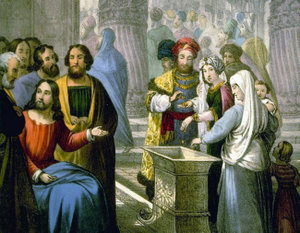 Đức Giê-su cùng với các môn đệ đang ngồi đối diện với thùng tiền dâng cúng. Ngài quan sát thấy nhiều người giàu có đến dâng cúng những món tiền lớn, nhưng Ngài chỉ để ý đến một bà góa nghèo đến dâng cúng hai đồng xu. Theo Kinh Thánh, các bà góa được liệt vào số những người nghèo nhất cùng với những kẻ mồ côi và những kẻ tha phương cầu thực (Đnl 24: 17-22). Số tiền bà bỏ vào thùng dâng cúng chẳng đáng là bao so với những món tiền lớn của những người giàu có. Nhưng Chúa Giê-su không đánh giá của dâng cúng dựa trên số lượng mà trên chất lượng. Ngài muốn các môn đệ của Ngài phải ghi khắc điều nầy: “Thầy bảo thật anh em: bà góa nghèo nầy đã bỏ vào thùng nhiều hơn ai hết. Quả vậy, mọi người đều rút ra từ tiền dư bạc thừa của họ mà đem bỏ vào đó; còn bà nầy, thì rút từ cái túng thiếu của mình mà bỏ vào đó tất cả tài sản, tất cả những gì bà có để nuôi sống mình”. Của dâng cúng của bà góa nầy, xét về số lượng, chẳng có nghĩa lý gì, nhưng xét về chất lượng, lại chất nặng đức tin, đức cậy và đức mến của bà, vì bà đã đặt mọi ngày sắp đến của mình vào tình yêu quan phòng của Chúa.