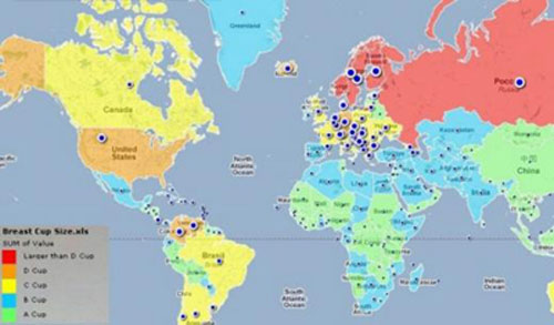 Theo những sắc màu biểu thị này có thể nhận ngay ra phụ nữ có vòm ngực lớn phần lớn tập trung ở các nước thuộc bắc bán cầu. Độ lớn trung bình của vòm ngực phụ nữ Nga, Na Uy, Phần Lan… đều được đánh dấu tròn đỏ, chứng tỏ đều ở mức trên D.