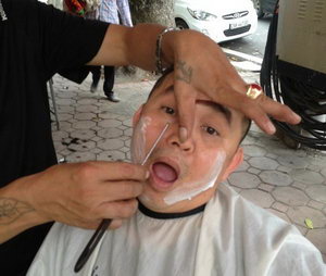 Anh chàng bỏ hòn bi vào miệng. Ông thợ bắt đầu cạo, nhanh và khéo. Bỗng anh kia nói:
