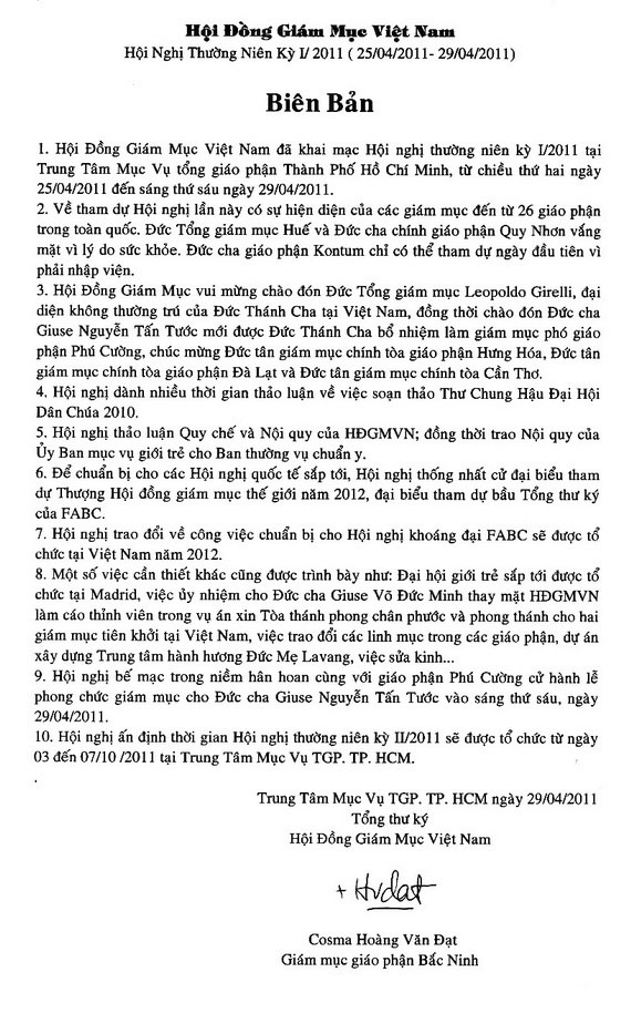 Biên bản Hội nghị Thường niên kỳ 1/2011 của Hội đồng Giám mục Việt Nam
