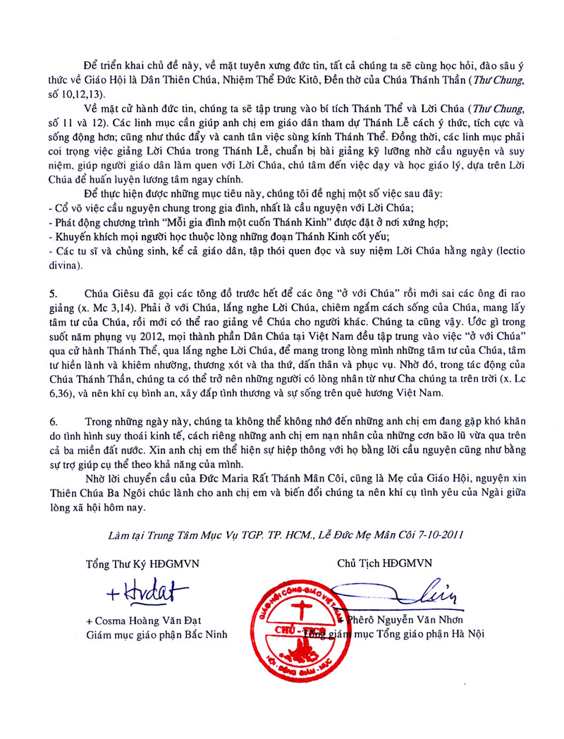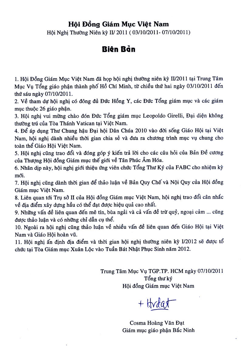 Hội đồng Giám mục Việt Nam đã tiến hành Hội nghị Kỳ 2/2011 tại Trung tâm Mục vụ TGP Tp HCM từ ngày 3 đến 7 tháng 10 năm 2011 với sự hiện diện đông đủ của các giám mục đang làm việc tại 26 giáo phận.