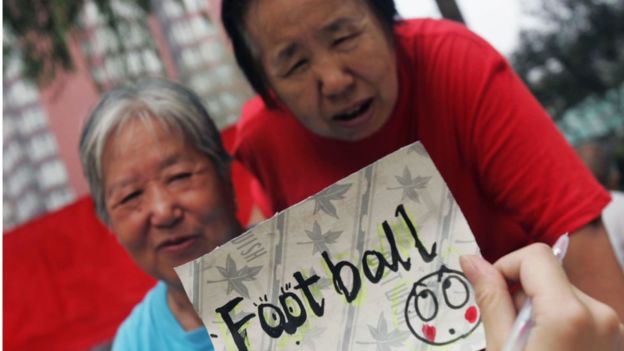 Người cao tuổi học tiếng Anh ở một khu chung cư ở Bắc Kinh, Trung Quốc.