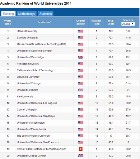 Bảng xếp hạng các trường đại học thế giới 2014 (ARWU) vừa được công bố bởi Trung tâm Đại học đẳng cấp thế giới thuộc ĐH Giao thông Thượng Hải (Trung Quốc).