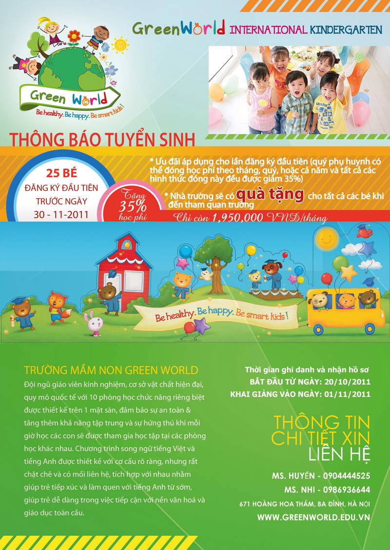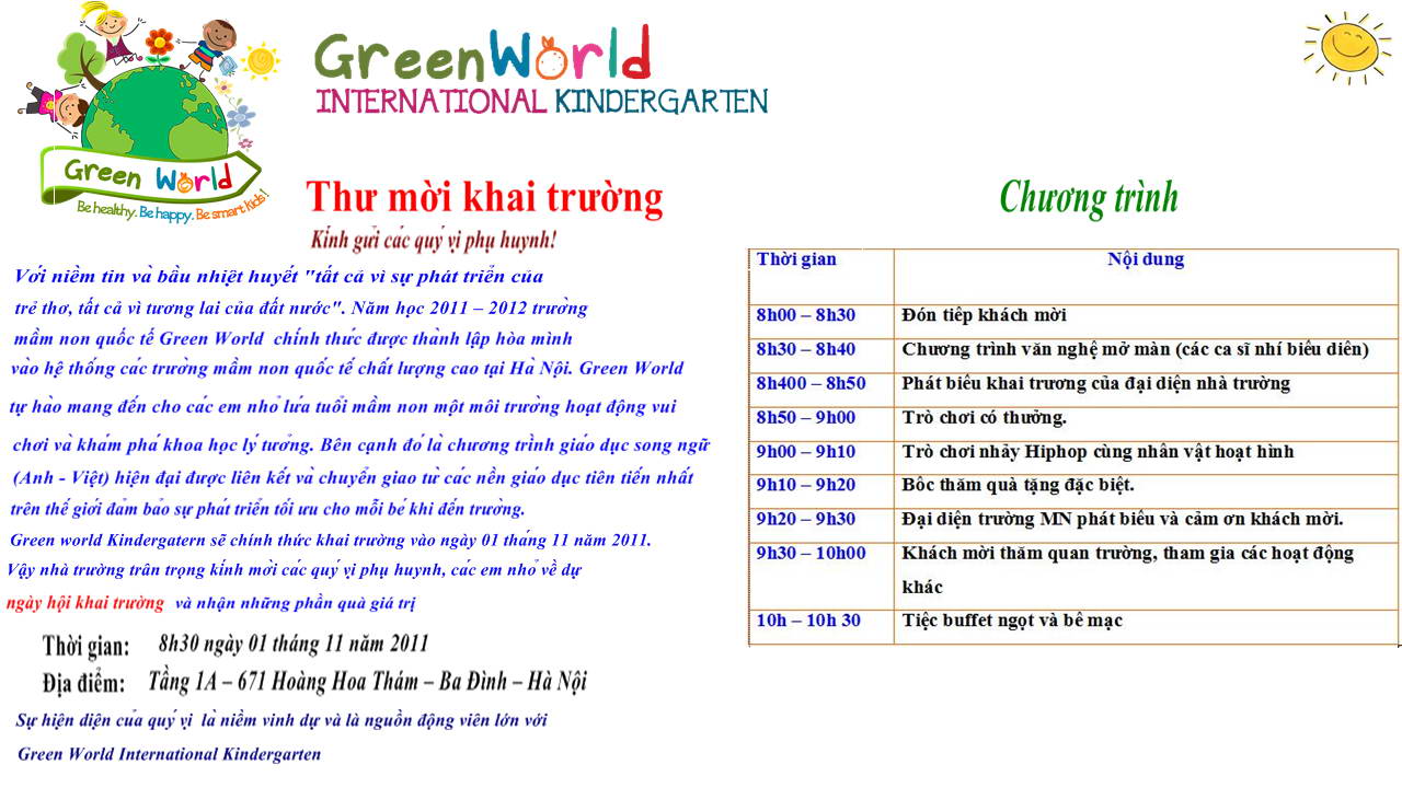 Vào lúc 8g30 ngày 01-11-2011, cháu Đỗ Nguyễn Yến Nhi, con gái út của anh Đỗ Thắng Cảnh PX60 sẽ khai trương Trường Mầm Non “GreenWorld International Kindergarten” tại số 671 Hoàng Hoa Thám, quận Ba Đình, Hà Nội.