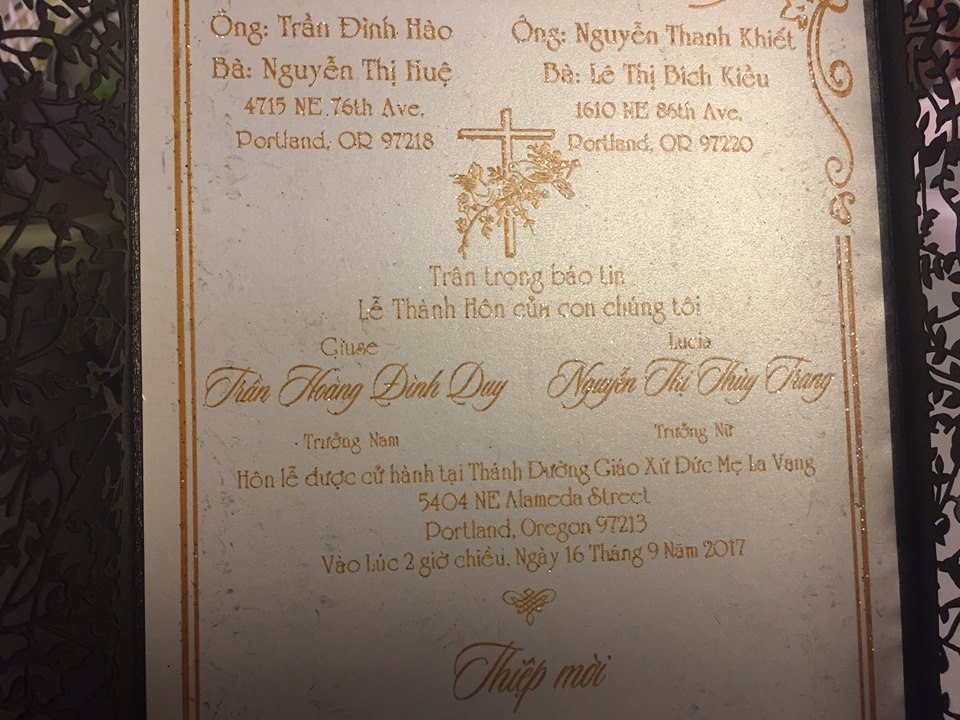 Giuse Trần Hoàng Đình Duy, trưởng nam của anh chị Trần Đình Hào HT72, sẽ kết hôn với Lucia Nguyễn Thị Thùy Trang. Hôn lễ được cử hành tại Thánh đường Giáo xứ Đức Mẹ La Vang, Portland, Oregon, ngày 16/9/2017.