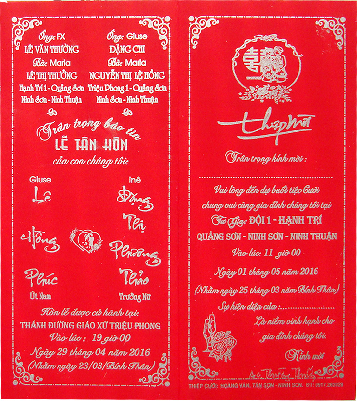 Cháu Giuse Lê Hồng Phúc, Út Nam của anh chị Lê Văn Thường PX53, sẽ kết hôn với Inê Đăng Thị Phương Thảo. Hôn lễ được cử hành tại thánh đường giáo xứ Triệu Phong lúc 19g ngày 29/4/2016.