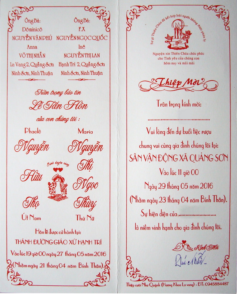 Cháu Phaolô Nguyễn Hữu Thọ, Út Nam của anh Nguyễn Văn Phú HT67, sẽ kết hôn với Maria Nguyễn Thị Ngọc Thùy. Thánh lễ Hôn phối được cử hành tại thánh đường giáo xứ Hạnh Trí, giáo hạt Ninh Sơn, Ninh Thuận vào lúc 19g ngày 27-5-2016.