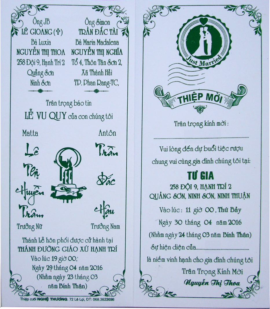 Cháu Matta Lê Thị Huyền Trâm, trưởng nữ của anh chị Lê Gioang HT72 [RIP], sẽ kết hôn cùng Antôn Trần Đắc Hậu. Hôn lễ sẽ được cử hành tại thánh đường giáo xứ Hạnh Trí, giáo phận Nha Trang vào lúc 19g ngày 29-4-2016.