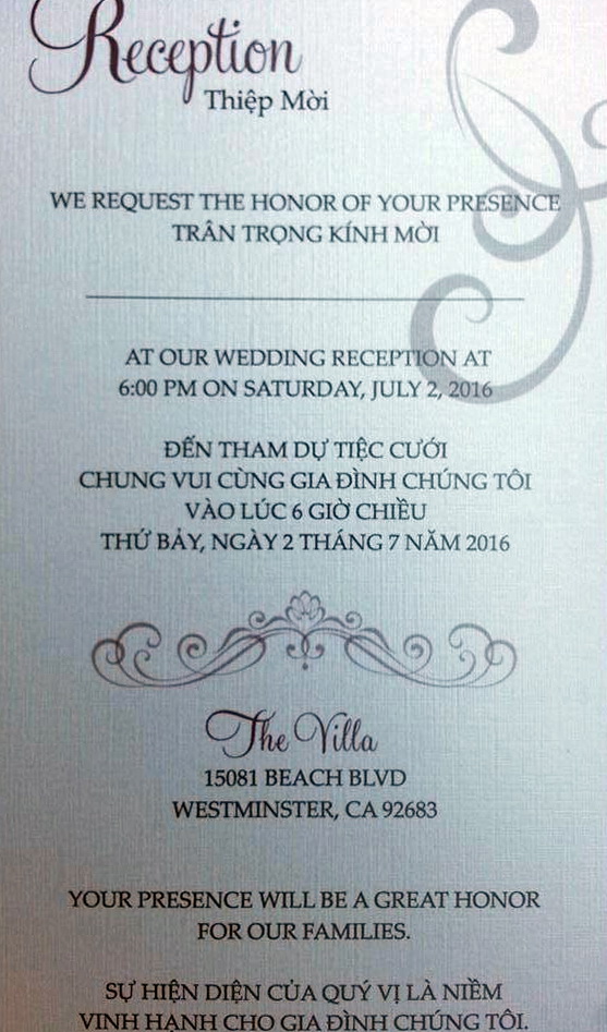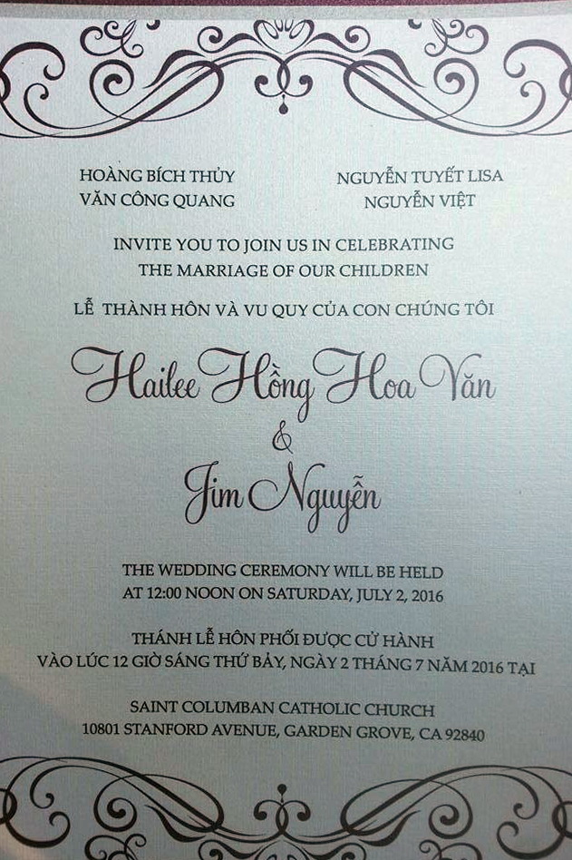 Hailee Hồng Hoa Văn, ái nữ của anh chị Văn Công Quang HT72, sẽ kết hôn với Jim Nguyễn. Hôn lễ sẽ được cử hành vào ngày 02/7/2016 tại Saint Columban Catholic Church, Garden Grove, CA.
