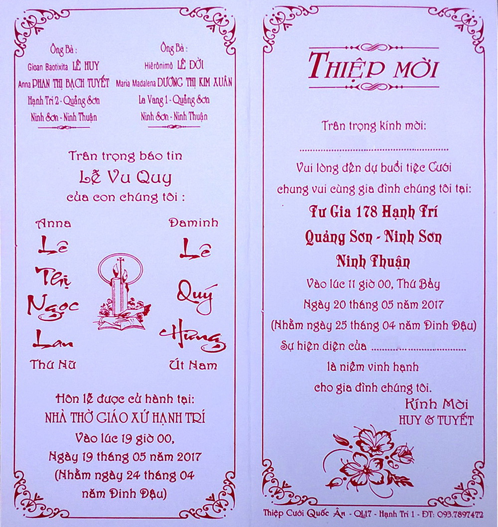 Anna Lê Thị Ngọc Lan, thứ nữ của ông bà Lê Huy HT67, sẽ kết hôn với Đaminh Lê Quý Hưng. Hôn lễ sẽ được cử hành tại nhà thờ giáo xứ Hạnh Trí vào lúc 19g00 ngày 19/5/2017.