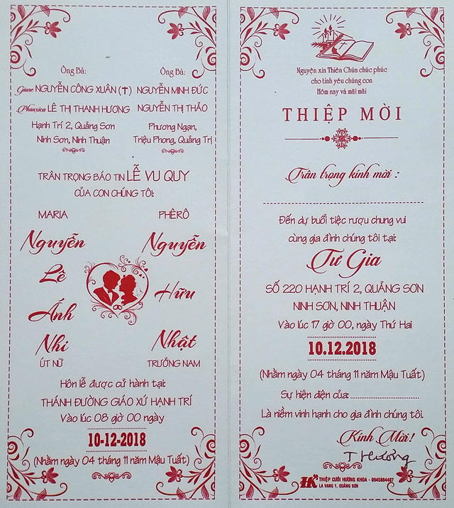 BBT nhận được tin cháu Maria Nguyễn Lê Ánh Nhi, út nữ của anh Nguyễn Công Xuân HT71 [+], kết hôn cùng Phêrô Nguyễn Hữu Nhật. Thánh lễ hôn phối được cử hành lúc 08g tại nhà thờ giáo xứ Hạnh Trí, ngày 10/12/2018.