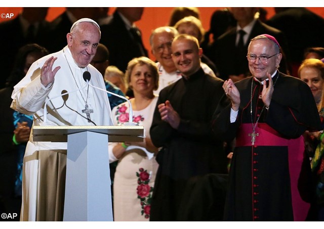 Lúc 3 giờ 15 phút chiều ĐTC đã từ đại chủng viện thánh Carlo Borromeo đi xe tới Công viên lịch sử độc lập quốc gia để gặp gỡ cộng đoàn nói tiếng Tây Ban Nha và các người di cư khác.