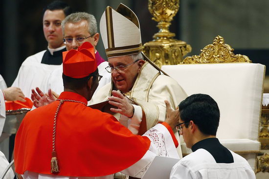 Kế đến, từng Hồng Y lần lượt tiến lên quì trước mặt ĐTC để ngài đội mũ đỏ Hồng Y, với lời nhắn nhủ: