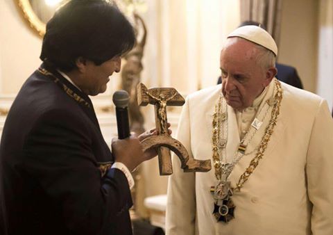 | Cây Thánh Giá Cộng Sản? Bolivia và Vatican vội vàng cải chính. Trong dịp trao đổi quà tặng tại dinh Tổng Thống ở La Paz tối thứ Tư, vị Tổng thống thiên tả cuả Bolivia, Evo Morales, đã bất ngờ trao cho Đức Giáo Hoàng Phanxicô một "cây thánh giá cộng sản", có hình Chúa Kitô chịu đóng đinh trên một cái búa dựng trên một ngọn đồi có hình lưỡi liềm. Video cho thấy ĐGH có vẻ ngỡ ngàng, tuy những tiếng clicks cuả máy hình làm cho Audio không còn rõ ràng, nhưng nghe như Đức Thánh Cha đã nói, “No está bien eso” ( “This is not ok” – "Nó không bình thường"). Văn phòng tổng thống cuả Bolivia đã vội vàng sửa chữa cái 'hố' về ngoại giao cuả họ, ra thông cáo cải chính rằng cử chỉ cuả Tổng Thống không có chủ ý xúc phạm và không có ẩn ý chính trị hoặc ý thức hệ nào cả. Nhưng báo chí Thế Giới thì lập tức đặt ra nhiều vấn đề về ông Morales, cho rằng ông đã cố gắng 'chính trị hoá' cuộc tông du, và nhắc lại những quá khứ thường xuyên chống lại Giáo Hội Công Giáo và áp đặt chủ nghĩa xã hội của ông từ khi ông lên nắm quyền vào năm 2006. Ngay cả những lời chỉ trích nhẹ nhàng nhất thì cũng cho rằng đó là một sự 'thiếu tế nhị' trong ngoại giao, và có thể là dị hợm. Nhất là khi so sánh món quà đó với món quà cuả Vatican, một tấm khảm có hình Đức Mẹ "Salus Populus Romani", là tấm hình nổi tiếng và được quí trọng nhất tại đền thờ Đức Bà Cả ở Roma. Trong thế giới 'nói tiếng Tây Ban Nha' thì đặc biệt ồn ào lên án cử chỉ cuả Morales, coi đó là một việc làm xúc phạm đến những nạn nhân của các nhóm khủng bố ở Châu Mỹ Latin và cuả các chế độ cộng sản độc tài toàn trị trong lịch sử. Đức Giám Mục Jose Munilla Aguirre của San Sebastián, người Tây Ban Nha, viết: "Đỉnh cao của sự kiêu ngạo là việc thao tác Thiên Chúa trong các dịch vụ của hệ thống tư tưởng vô thần... Hôm nay, lại một lần nữa: Chuá bị đóng đinh". Nhưng trong ngày thứ Năm đã có nhiều cố gắng cuả cả hai bên để xoa dịu dư luận. Chính ông tổng thống đã đích thân tới dự buổi lễ ngoài trời của Giáo Hội, ngồi trong hàng ghế cuả giáo dân và cố gắng len lỏi để được gặp mặt ĐGH trong giây lát khi Ngài đi xuống cầu thang cuối buổi lễ. Chính phủ Bolivia khẳng định món quà không phải là một thủ đoạn chính trị, nhưng là một biểu tượng mô tả "Đức Giáo Hoàng là của người nghèo", là một điều mà ông Morales muốn nêu cao. "Đó là ý định của món quà này, chứ không phải bất kỳ cơ động nào khác... Đó là từ một tình cảm trung thực và tuyệt vời, là một tác phẩm được thiết kế bởi chính bàn tay của LM Luis Espinal", theo lời ông Bộ trưởng Giao thông Marianela Paco nói trên đài phát thanh Patria Nueva. Còn trong buổi họp báo, phát ngôn viên Vatican là linh mục Federico Lombardi cho biết rằng ĐGH đã không biết rằng chính cố LM Espinal là người đã thiết kế ra cây thánh giá đó và đã ngạc nhiên khi nhìn thấy nó, câu nói cuả ĐGH (sau khi nghe ông tổng thống giải thích) có thể mang một ý nghĩa là "điều này thì lạ" chứ không phải "điều này thì không tốt". Nhắc lại, linh mục Luis Espinal, dòng Tên, là người đã bị lực lượng dân quân thiên hữu cuả Bolivia ám sát năm 1980 trước một cuộc đảo chính cuả quân đội. Trong dịp Tông Du này, ĐTC Phanxicô đã dừng xe lại để cầu nguyện ít phút ngay tại nơi mà thi thể cuả người bạn 'đồng môn đồng liêu' (cùng một Dòng) đã bị vất bỏ trong đống rác bên vệ đường. "Anh Chị Em thân mến. Tôi dừng lại ở đây để chào đón anh chị em và trên tất cả để nhớ. Để nhớ lại một người anh em, một người anh em của chúng tôi, một nạn nhân của những người không muốn anh ta chiến đấu cho sự tự do của Bolivia," Đức Giáo Hoàng đã nói như thế với những người tụ tập tại đó. "Xin Chúa Kitô nhận lấy anh. Xin Chúa cho anh yên nghỉ đời đời và ánh sáng chiếu rọi lên anh không bao giờ tắt. " Cha Lombardi cho biết LM Espinal là một nghệ sĩ đã sáng tác ra cây thánh giá đó như là một biểu tượng của sự đối thoại và cam kết tự do và tiến bộ cho Bolivia, chứ không có ý định về bất kỳ ý thức hệ cụ thể nào. Cha Lombardi cũng cho biết riêng cá nhân cuả Ngài thì không cảm thấy bị xúc phạm. "Bạn có thể tranh cãi về ý nghĩa và việc sử dụng các biểu tượng, nhưng nguồn gốc là từ LM Espinal và ý nghĩa của nó là về một cuộc đối thoại cởi mở, chứ không phải là về một tư tưởng cụ thể nào cả", Cha Lombardi nói. Ngài lưu ý về giai đoạn lịch sử mà LM Espinal sống: là một linh mục tranh đấu cho công bằng xã hội ở Bolivia trong một thời kỳ bất ổn và ngay trước một chế độ độc tài thiên hữu khét tiếng với những vi phạm nhân quyền. Mà thực vậy, Cha Xavier Albo Dòng Tên, một người bạn cùng sống với LM Espinal lúc đó, đã cho biết rằng ý định cuả LM Espinal là mong muốn Giáo Hội đối thoại với chủ nghĩa Mác, và nói LM Espinal đã thay