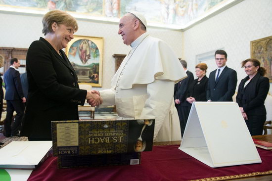 Trong phần trao đổi quà tặng theo truyền thống, bà Merkel đã trao cho Đức giáo hoàng một ngân khoản dành tặng cho các trẻ em tị nạn Iraq và Syria, một hộp CD nhạc của Bach và một cuốn sách. Còn Đức giáo hoàng tặng lại bà Thủ tướng kỷ niệm chương có hình Thánh Martin đang trao chiếc áo choàng của ngài cho người nghèo; để nhắc nhở các nhà lãnh đạo trên thế giới rằng nhiệm vụ của họ là phải “bảo vệ người nghèo”. Đức Thánh Cha cũng tặng bà Merkel một bản Tông huấn Evangelii Gaudium bằng tiếng Đức - và bà Thủ tướng “hứa sẽ đọc” văn kiện này.