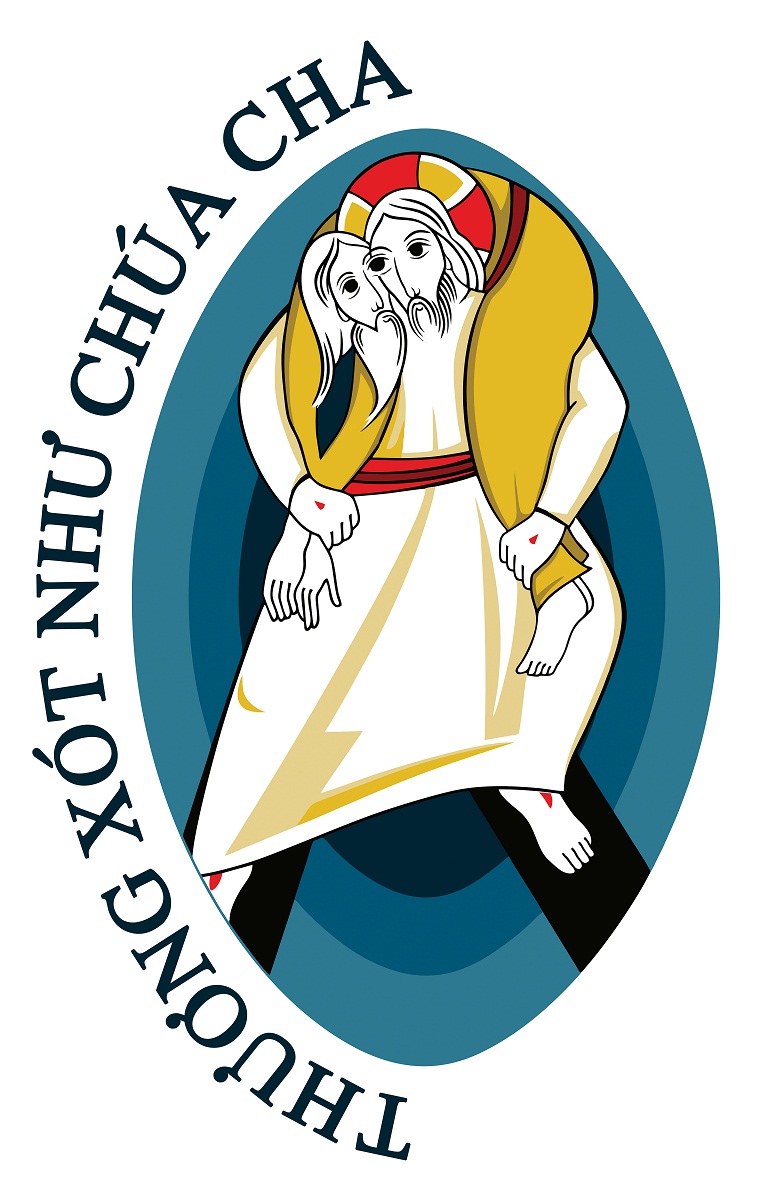 Câu khẩu hiệu trong tiếng Việt: Thương xót như Chúa Cha.
