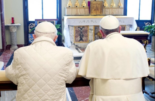 Hai ngài đã thảo luận, dùng cơm trưa và cùng nhau cầu nguyện. Khi vào nhà nguyện, Đức Giáo Hoàng Danh dự Bênêđictô 16 hướng dẫn Đức Giáo Hoàng Phanxicô quỳ gối tại nơi dành cho Đức Giáo Hoàng trước bàn thờ nhưng Đức Giáo Hoàng Phanxicô từ chối, Ngài nói với Đức Giáo Hoàng Danh dự là “Chúng ta là anh em” và khẩn nài cả hai cùng cầu nguyện bên cạnh nhau.