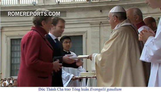 Một điểm đặc biệt trong Thánh lễ là nghi thức trao Tông huấn Evangelii gaudium (Niềm vui Phúc Âm) vào cuối lễ - cho các tín hữu đại diện mỗi bậc sống trong Giáo hội, và nhiều thành phần ơn gọi, gồm có: một giám mục, một linh mục, một phó tế, một tu sĩ, một nữ tu, tập sinh, một gia đình, giáo lý viên, nghệ sĩ, phóng viên, người trẻ, người già và bệnh nhân. Tông huấn này là tài liệu kết thúc Thượng Hội đồng Giám mục hồi năm ngoái, với chủ đề “Tân Phúc-Âm-Hóa để thông truyền Đức Tin Kitôgiáo”. Tông huấn sẽ được chính thức giới thiệu vào ngày thứ Ba, 26-11 sắp tới.