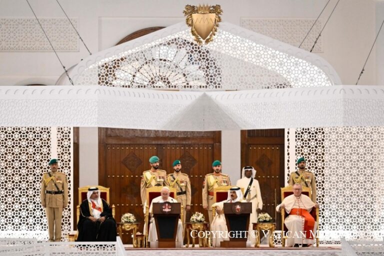 Để đưa ra thông điệp của mình, Đức Thánh Cha Phanxicô đã chọn nơi long trọng nhất trong chuyến tông du của mình. Chính ở giữa sân của cung điện hoàng gia, một hình chữ nhật lớn bằng đá cẩm thạch trắng tỏa sáng trong đêm của Bahrain, và dưới lá cờ đỏ trắng khổng lồ của đất nước, mà Đức Thánh Cha đã đọc một bài diễn văn chính trị nổi bật. Trước mặt nhà vua, ngài đã kêu gọi các nhà chức trách tôn trọng nhân quyền, đang khi Bahrain bị các tổ chức phi chính phủ chỉ trích rất nhiều về số phận mà nó dành cho đa số người Shiite.
