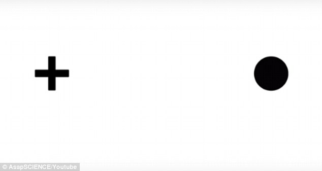 Giờ hãy dùng tay che mắt trái, sau đó dùng mắt phải nhìn vào dấu cộng. Bạn sẽ thấy hình tròn đen bên phải biến mất. Lý do là vì lúc này, hình tròn đen đó đã rơi vào điểm mù của mắt.