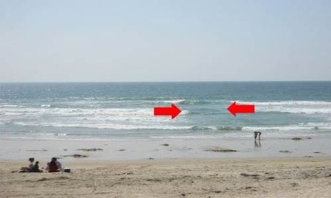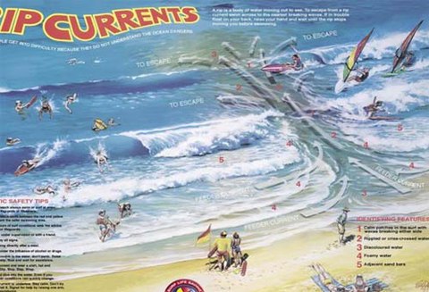 Trong hình trên đây, nơi có sóng bạc đầu là nơi dòng nước đi từ biển vào gần bờ. Nếu chúng ta tắm biển nơi có sóng bạc đầu (breaking waves) thì chúng ta sẽ được sóng đánh đưa vào bờ. Tuy nhiên nếu chúng ta di chuyển vào tắm chỗ lặng sóng (giữa hai mũi tên) là chúng ta rơi vào dòng chảy xa bờ. Dòng sông nhỏ này sẽ lập tức kéo phăng chúng ta ra xa khỏi bờ và đưa thẳng chúng ta ra biển. Như vậy, vùng có sóng là vùng nước an toàn, còn vùng lặng sóng chính là vùng nguy hiểm.