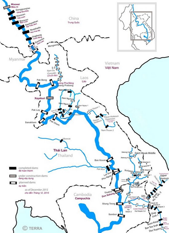 Sơ đồ các đập thủy điện hiện nay trên sông Mê Kông.