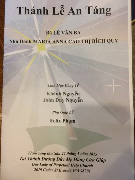 Kính mời xem một số hình ảnh tang lễ Bà Anna Maria Cao Thị Bích Quy, phu nhân NT Lê Văn Ba AN41, vừa được Chúa gọi về lúc 18g40 ngày 14-5-2015 tại tiểu bang Washington, USA.