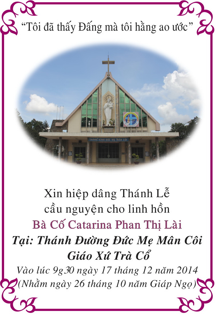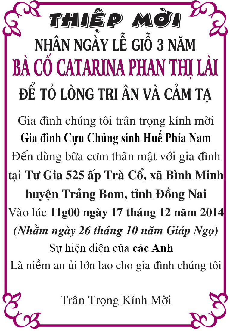 Thiệp Mời Gia đình CCS Huế Phía Nam: Nhân lễ giỗ 3 năm Bà Cố Catarina Phan Thị Lài, thân mẫu của linh mục PX Phan Chiếm HT69, kính mời tham dự, hiệp thông, cầu nguyện...