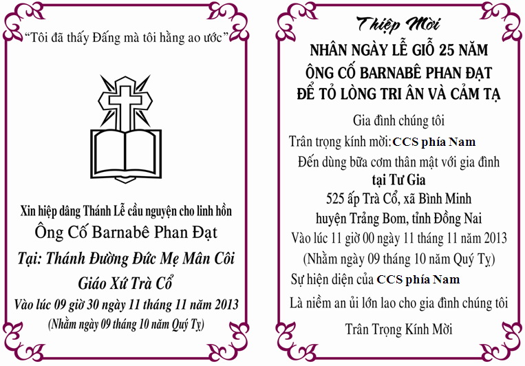 Thánh lễ Giỗ 25 năm Cụ Barnabê Phan Đạt, thân phụ của linh mục PX. Phan Chiếm HT69 sẽ được cử hành vào lúc 9g30 ngày 11-11-2013 tại nhà thờ Đức Mẹ Mân Côi, giáo xứ Trà Cổ, giáo phận Xuân Lộc. BBT kính chuyển đến quý Cha và quý Anh Em Thư Mời tham dự.