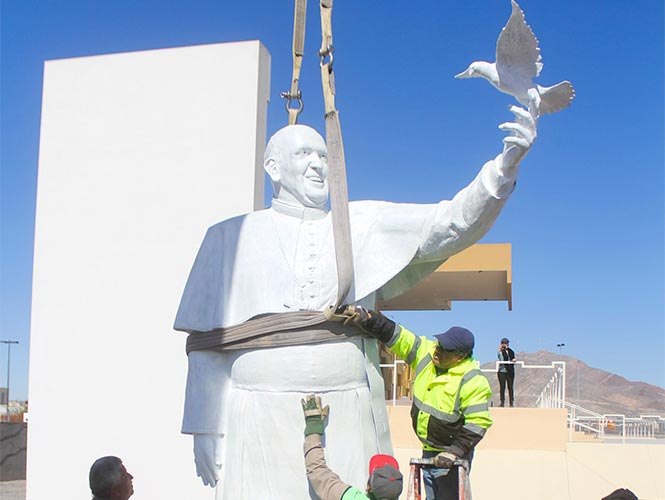 Đức Phanxicô ở biên giới Mêhicô-Mỹ ngày 17 tháng 2-2016  Bức tượng “El Punto” cao 4.60 mét, nặng 1.110 kílô.  Bức tượng “El Punto” được dựng lên ở Ciudad Juarez, nơi Đức Giáo hoàng đã viếng thăm vào năm 2016.  Bức tượng “El Punto” cao 4.60 mét, nặng 1.110 kílô.  Các người làm tượng đã làm việc chặt chẽ với nhà điêu khắc từ từng chi tiết theo nhân cách và trang phục của Đức Phanxicô.  Bức tượng “El Punto” cao 4.60 mét, nặng 1.110 kílô.  Bức tượng “El Punto” cao 4.60 mét, nặng 1.110 kílô. |