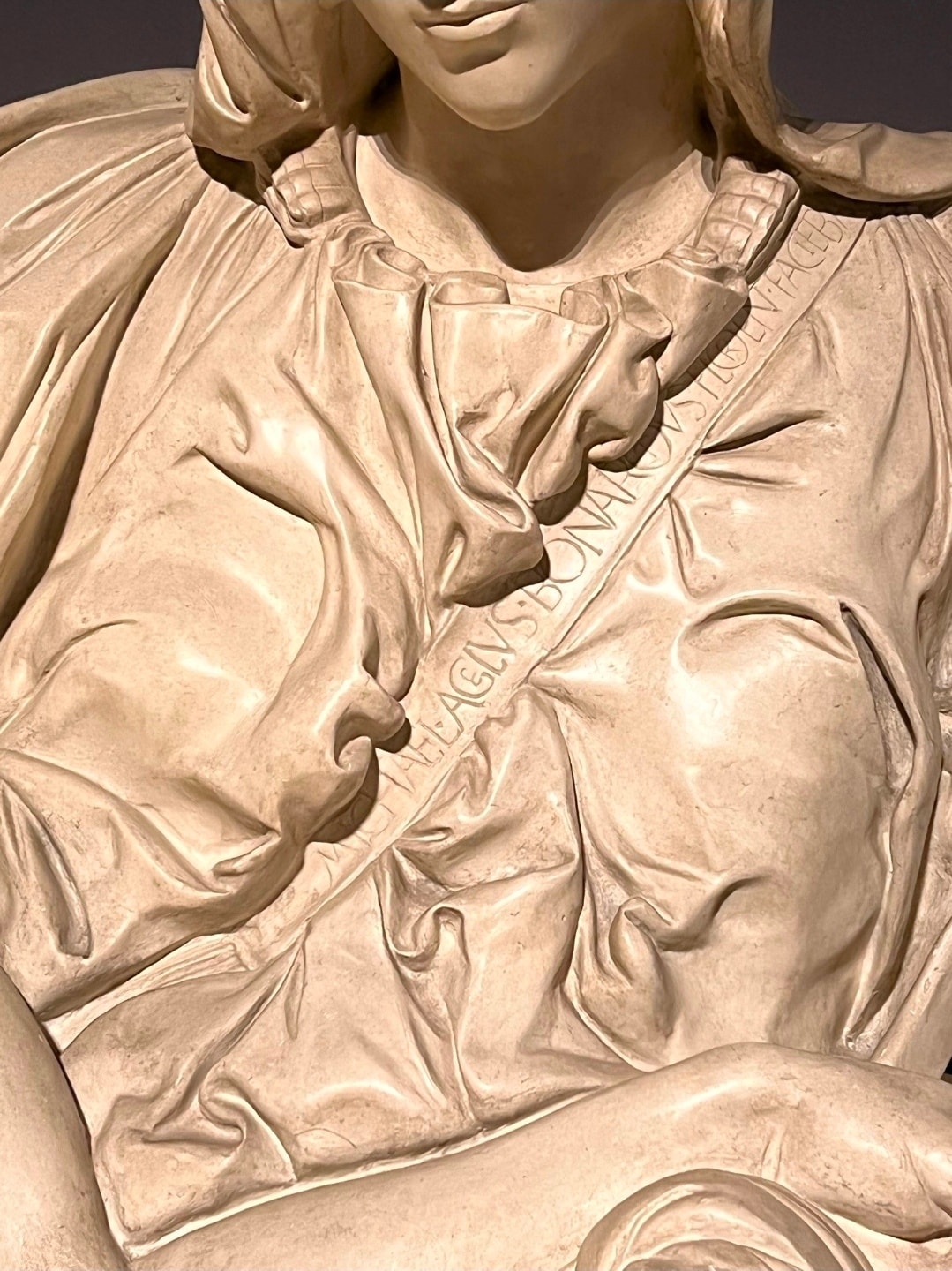 Các giai thoại về Pietà luôn xoay quanh một điều: Michelangelo quyết định ký tên lên tác phẩm. Trong bối cảnh Florence và Lombardy tranh nhau vị trí trong nghệ thuật, vài người lầm tưởng Pietà được tạo bởi một bậc thầy miền Bắc. Một đêm khuya, Michelangelo trở lại nhà nguyện Santa Petronilla, khắc dòng chữ “Michael Angelus Bonarotus Florentinus faciebat” lên dải sash trước ngực Đức Mẹ. Giorgio Vasari kể rằng chính ông cảm thấy xấu hổ sau đó và thề không bao giờ ký tên lên bất cứ tác phẩm nào nữa. Pietà trở thành chứng nhân duy nhất cho cuộc đấu tranh giữa lòng tự trọng và khát vọng khẳng định bản thân của Michelangelo.
