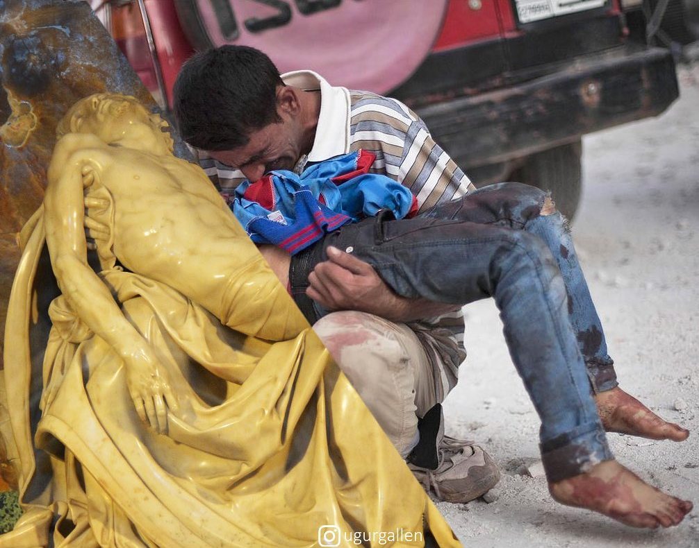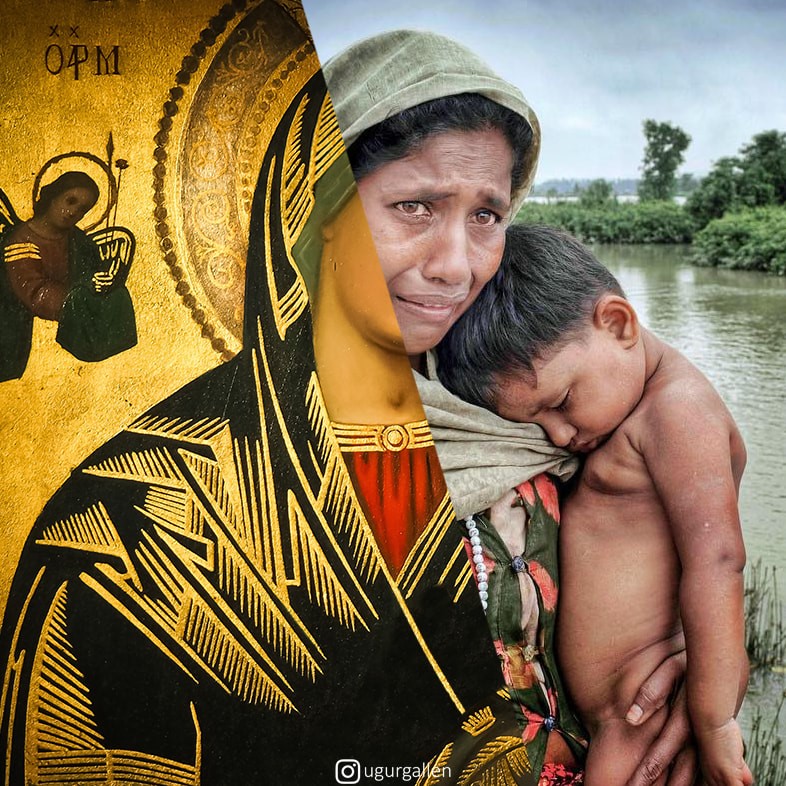 Đôi khi Gallenkuş sử dụng hình ảnh từ lịch sử nghệ thuật để tạo sự tương phản—hoặc như tôi thấy, là sự tiếp nối. Ví dụ như tác phẩm Rohingya Mother and Child, nơi những người tị nạn từ Myanmar sang Bangladesh hòa vào hình ảnh biểu tượng dát vàng, hay Syrian Pietà, cho thấy một người cha ở Aleppo ôm thi thể con trai mình. Sự liên hệ với hình ảnh tôn giáo truyền thống nhấn mạnh giá trị thiêng liêng của con người—những người mang hình ảnh của Thiên Chúa—và khẳng định sự hiện diện của Chúa Kitô với những người đau khổ. Mong rằng chúng ta đừng quay lưng.