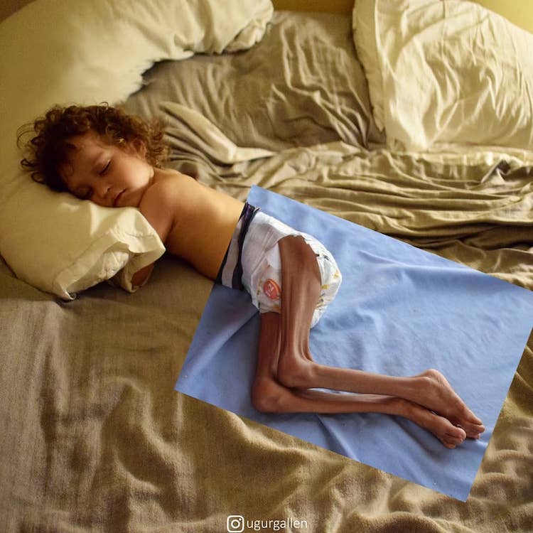 Nhiều thập kỷ xung đột đã khiến các quốc gia như Afghanistan đầy rẫy mìn, đạn pháo và bom. Năm 2018, khi mười đứa trẻ trong cùng một gia đình đang đi bộ đến trường, một em nhặt lên một vật lạ—đó là một quả đạn cối chưa nổ. Nó phát nổ, giết chết ba em. Bảy em còn lại mỗi em đều mất ít nhất một chi. Gallenkuş đặt hình ảnh một bé gái cụt chi chống nạng cạnh một đứa trẻ vô tư đang trượt tuyết, để cho thấy sự khác biệt giữa những nguy hiểm chết người mà một số trẻ phải đối mặt hằng ngày và những “mạo hiểm” giải trí mà trẻ em ở nơi khác có thể lựa chọn.