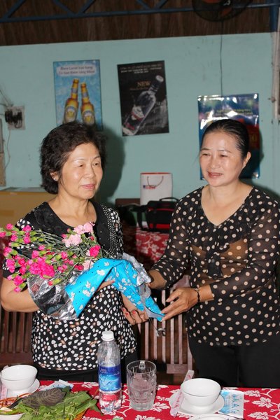Chị Linh, phu nhân Lê Tùng đang tặng hoa cho chị Thủy, phu nhân anh Nguyễn Cả.