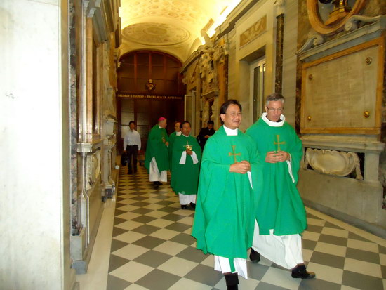 Có khoảng hơn 50 khách hành hương người Việt và nước ngoài tham dự Thánh lễ cầu nguyện cho Đức Cố HY PX Nguyễn Văn Thuận, đa số đến từ châu Âu, châu Mỹ, một số từ châu Úc, khoảng 10 người đến từ Việt Nam… được hướng dẫn xuống tầng hầm bên dưới Đền Thánh Phêrô. Trong tầng hầm này có nhiều nhà nguyện chung quanh mộ Thánh Phêrô. Mỗi nhà nguyện đều có bàn thờ riêng để dâng thánh lễ. Đây cũng là nơi tập trung các phần mộ của nhiều Giáo Hoàng. Có 147 trong số 264 phần mộ các Đức Giáo hoàng được chôn cất tại đây. Nhà nguyện Saint Joseph đối diện với lối vào ngôi mộ Thánh Phêrô.