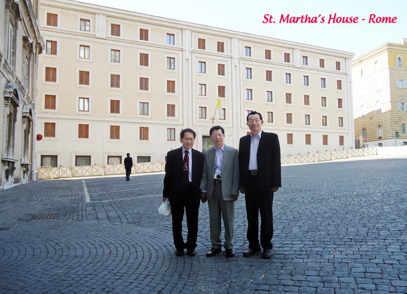 Vì muốn tham quan St. Martha's House (tiếng la tinh là Domus Sanctae Marthae), nơi Đức Thánh Cha đang cư ngụ, chúng tôi được Đức Ông FX Cao Minh Dung đưa vào qua hướng cổng dành riêng cho các viên chức làm việc tại Vatican. Khác với bên ngoài Quảng trường, khu vực này vắng ngắt không một bóng người, đó đây là những trạm gác của vệ binh, họ đứng nghiêm tay đưa lên trán chào mỗi khi chúng tôi đi qua. Đây là ngôi nhà được xây dựng dưới triều Đức Thánh Cha Gioan-Phaolô II. Việc xây dựng được hoàn tất năm 1996 và được sử dụng như một Nhà Khách và nơi ở cho các viên chức cấp Bộ làm việc tại Vatican. Trong thời gian bầu Giáo Hoàng vừa qua, ngôi nhà này dùng làm nơi lưu trú cho các Hồng Y quy tụ về Roma. Sau khi được bầu làm Giáo Hoàng, Đức Thánh Cha Phanxicô đã chọn một phòng của ngôi nhà này làm nơi ở của ngài. Ngay lối cửa vào chính có treo cờ Tòa Thánh. Bên trong ngôi nhà được bài trí khá đơn giản và không gian rộng rãi, thoáng đãng. Thật sung sướng khi chúng tôi được phép vào thăm viếng bên trong ngôi nhà của Đức Thánh Cha. Ở đây không được phép chụp hình nên chúng tôi chỉ ghi lại vài hình ảnh từ bên ngoài.