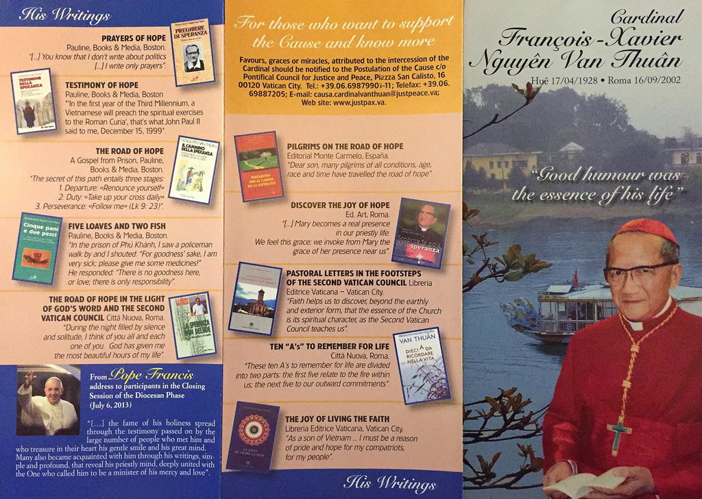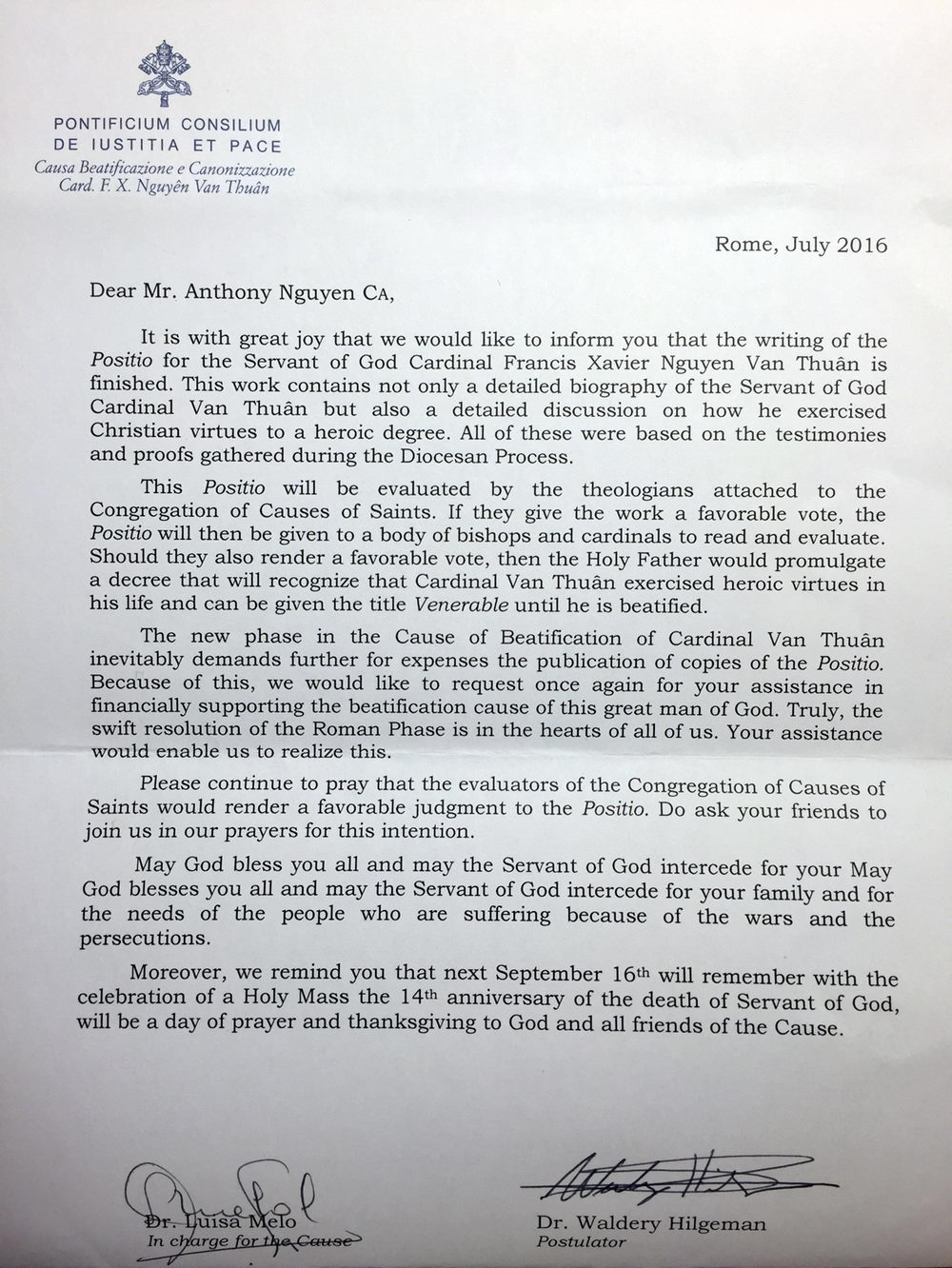 HỘI ĐỒNG TÒA THÁNH về CÔNG LÝ và HÒA BÌNH Án Phong Chân Phước và Phong Thánh Hồng Y Phanxicô Xavie Nguyễn Văn Thuận Roma, tháng Bảy năm 2016 Thân gởi Ông Antôn Nguyễn Cả, Với sự vui mừng lớn lao, chúng tôi thông báo cho Ông biết rằng bản văn Đề Án cho Tôi Tớ Chúa Đức Hồng Y Phanxicô Xavie Nguyễn Văn Thuận đã hoàn tất. Công trình này chứa đựng không những chỉ là tiểu sử với đầy đủ chi tiết của Hồng Y Tôi Tớ Chúa Nguyễn Văn Thuận, mà còn là những tranh luận tỉ mỉ về việc ngài thực hành các nhân đức của người Kitô Hữu ở môt mức độ anh hùng như thế nào. Tất cả những sự kiện này đều được căn cứ trên những chứng từ và chứng vật được thu thập trong Tiến Trinh Giáo Phận. Đề Án này sẽ được thẩm định bởi những nhà thần học trực thuộc Bộ Phong Thánh. Nếu công trình này được một sự biểu quyết thuận do quý vị này, Đề Án khi đó sẽ được chuyển qua Hội Đồng các Giám Mục và Hồng Y để đọc và thẩm định. Nếu các ngài trong Hội Đồng này cũng đưa ra một sự biểu quyết thuận, thì Đức Thánh Cha sẽ ban hành một sắc lệnh công nhận Đức Hồng Y Thuận đã thực hiện các nhân đức anh hùng trong cuộc sống và ngài có thể được trao tặng danh hiệu Đấng Đáng Kính cho đến ngày được phong Chân Phước. Giai đoạn mới trong Dự Án Phong Chân Phước của Đức Hồng Y Nguyễn Văn Thuận sẽ không tránh khỏi sự đòi hỏi những chi phí phụ trội cho việc phổ biến các bản sao của Đề Án. Vì thế, chúng tôi lại một lần nữa phải thỉnh cầu đến sự phụ giúp tài chánh từ quý vị để yểm trợ án phong chân phước cho con người vĩ đại này của Thiên Chúa. Thật sự, một sự quyết định nhanh chóng của Giai Đoạn Tòa Thánh Rôma nằm trong sự quan tâm của tất cả chúng ta. Mong rằng sự yểm trợ của quý vị cho chúng tôi khả năng thực hiện được điều này. Xin quý vị vui lòng tiếp tục cầu nguyện để các thẩm định viên của Bộ Phong Thánh may mắn đưa ra phán quyết thuận lợi cho Đề Án. Xin vui lòng kêu gọi các thân hữu của quý vị hiệp thông với chúng tôi trong lời cầu nguyện cho ý chỉ này. Xin Thiên Chúa chúc lành cho tất cả quý vị và xin Tôi Tớ Chúa chuyển cầu cho quý vị, cho gia đình quý vị, và cho những nhu cầu của những người đang đau khổ vì chiến tranh và bách hại. Đồng thời, chúng tôi nhắc nhở quý vị rằng ngày 16 tháng Chín tới đây sẽ là ngày đáng ghi nhớ để cử hành và tham dự Thánh Lễ vào dịp giỗ thứ 14 của Tôi Tớ Chúa. Đó sẽ là một ngày để cầu nguyện, cảm tạ Thiên Chúa, và nhớ ơn các thân hữu của Vụ Án. Ký tên, - Dr. Luisa Melo Đặc Trách về Vụ Án - Dr. Waldery Hilgeman Cáo Thỉnh Viên (NT Hoàng Xuân Tịnh AN41 chuyển ngữ) |