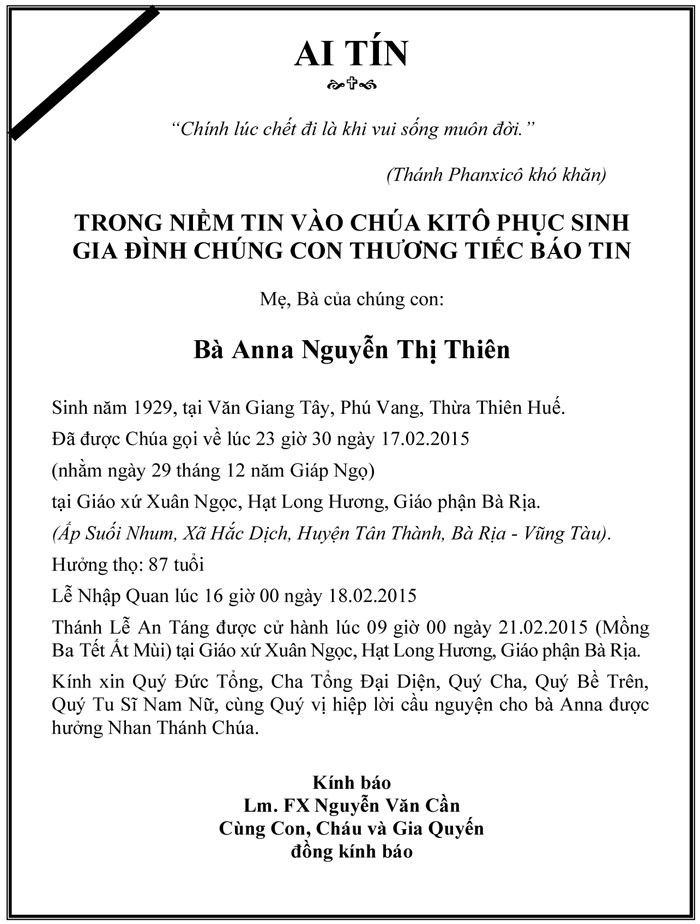 Bà Cố Anna là thân mẫu của linh mục FX Nguyễn Văn Cần HT65, anh Nguyễn Văn Ngọc HT69, vừa được Chúa gọi về lúc 23g30 ngày 17-2-2015 tại giáo xứ Xuân Ngọc, giáo phận Bà Rịa.