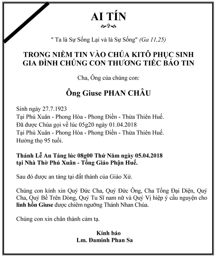 Ông Cố Giuse Phan Châu, thân phụ của linh mục Phan Sa PX61 đã được Chúa gọi về lúc 5g20 ngày 01-4-2018 tại Phú Xuân, Phong Hòa, Phong Điền, Thừa Thiên Huế, hưởng thọ 95 tuổi.