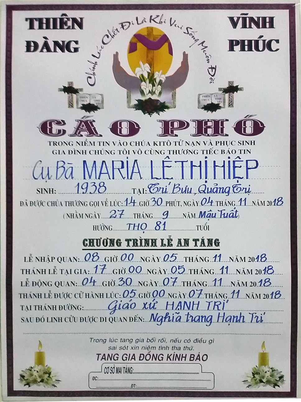 Trong niềm tin vào mầu nhiệm Phục sinh của Đức Kitô. Gia đình chúng con xin kính báo: Thân mẫu của con, Cụ Bà Maria Lê Thị Hiệp, vừa được Chúa gọi về lúc 14h30 ngày Chúa nhật 04/11/2018, tại giáo xứ Hạnh Trí, Quảng Sơn, Ninh Sơn, Ninh Thuận, hưởng thọ 81 tuổi.
