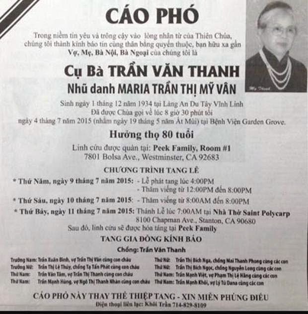 Cụ Bà Maria Trần Thị Mỹ Vân, nguyên quán An Du Tây, Vĩnh Linh, Quảng Trị, là thân mẫu anh Trần Văn Tâm HT72, vừa được Chúa gọi về lúc 20g30 ngày 04/7/2015 tại Westminster, California.