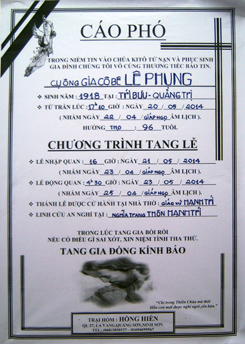 Ông Giacôbê Lê Phụng là nhạc phụ của anh Hoàng Đức Tuấn PX61 và anh Lê Du HT63, vừa được Chúa gọi về lúc 17g10 ngày 20-5-2014 tại Hạnh Trí, Quảng Sơn, Ninh Sơn, Ninh Thuận. [Cập nhật một số hình ảnh tẩn liệm].