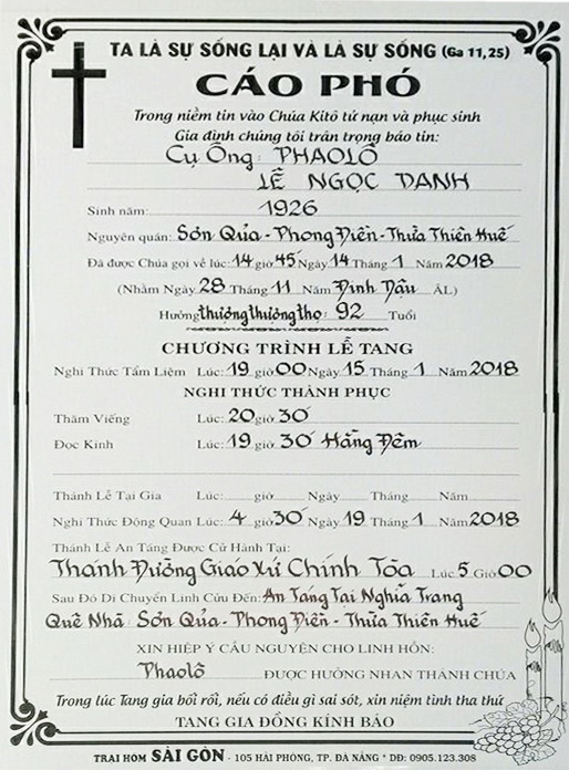 Đã được Chúa gọi về lúc 14g45 ngày 14 tháng 01 năm 2018 tại Đà Nẳng. Hưởng thọ 92 tuổi.